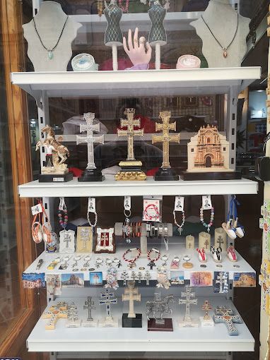 Venta de artículos de plata, llaveros, collares, artesanía local, libros, postales, camisetas, gorras, tazas, platos, ceniceros, cruces de mármol, objetos de cerámica con diseños alusivos al lugar.
